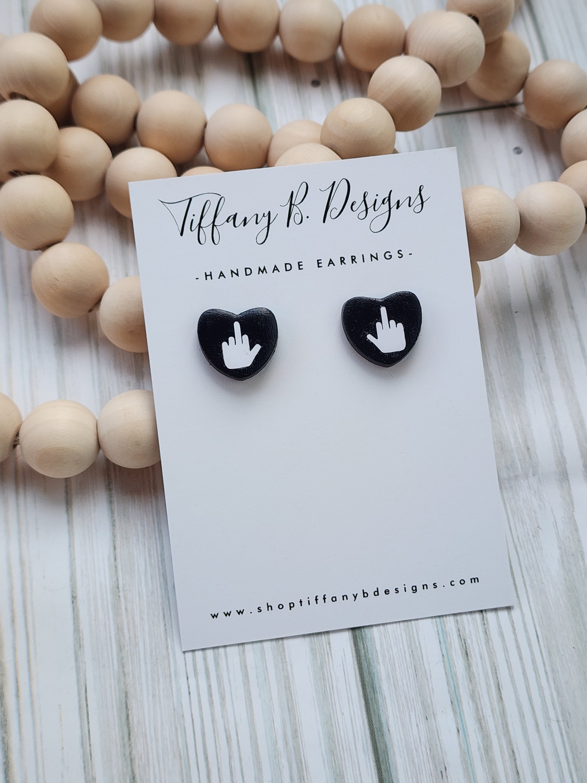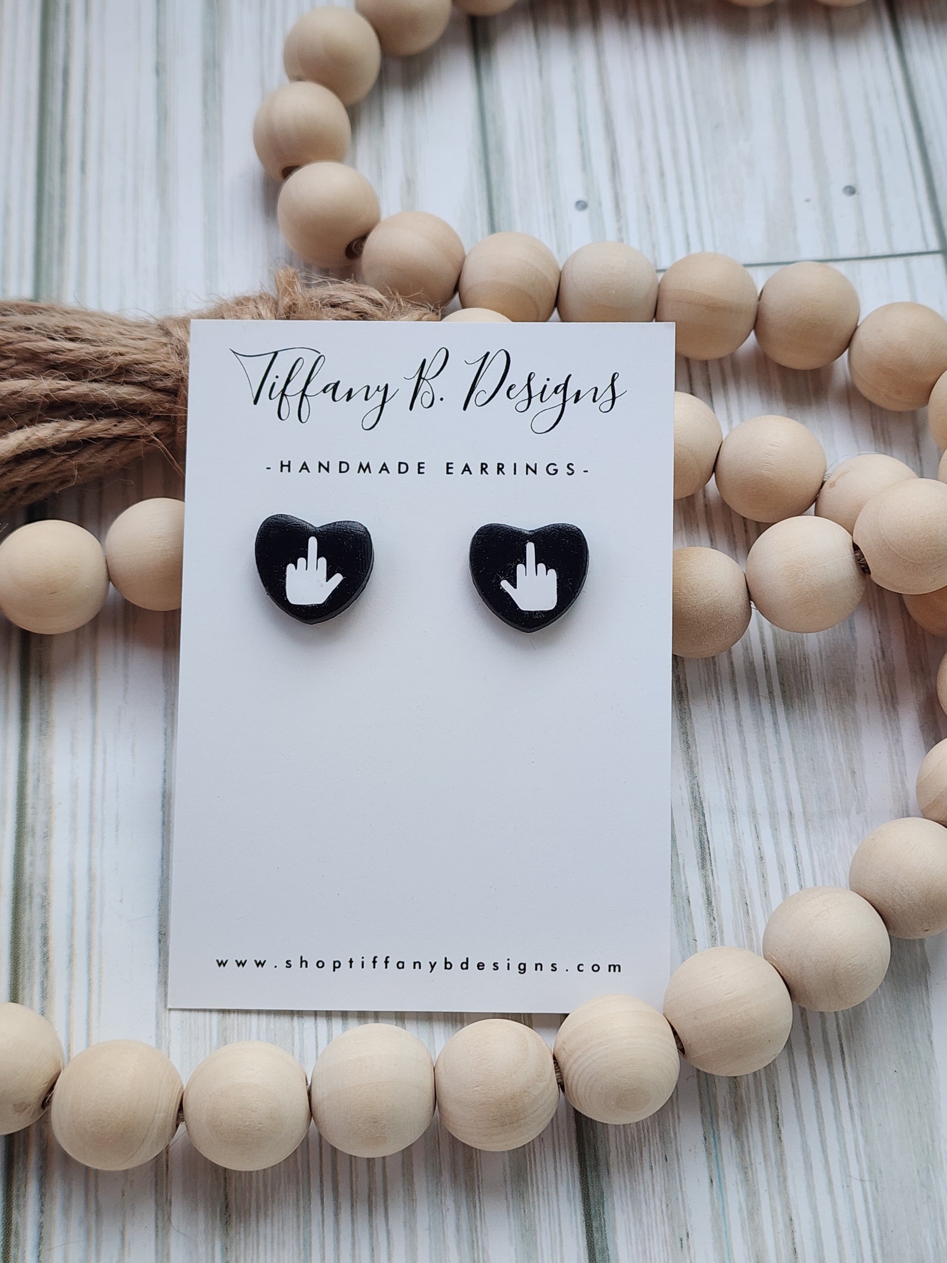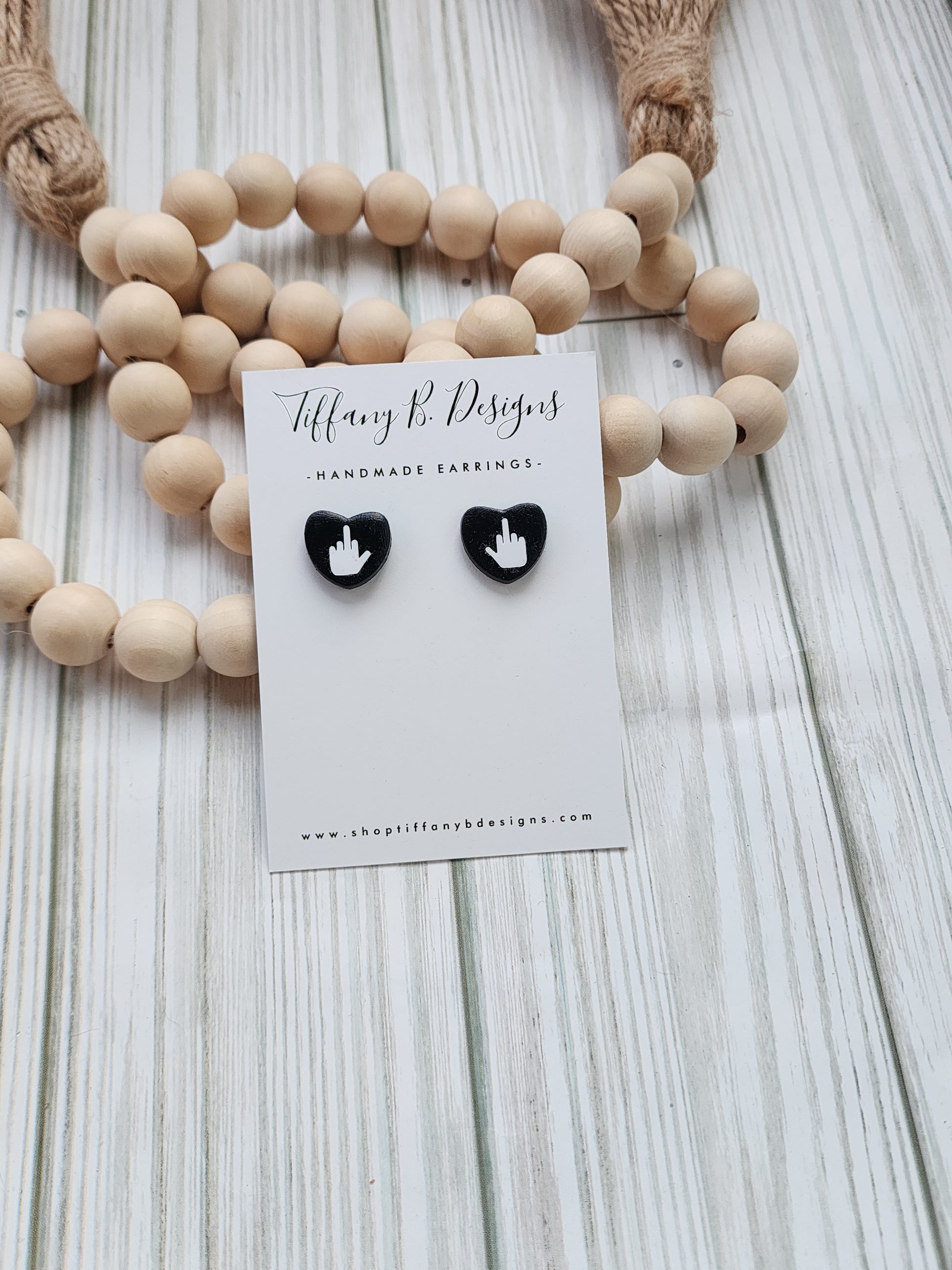 Black Clay Heart Studs with a middle finger and stainless steel backing.
