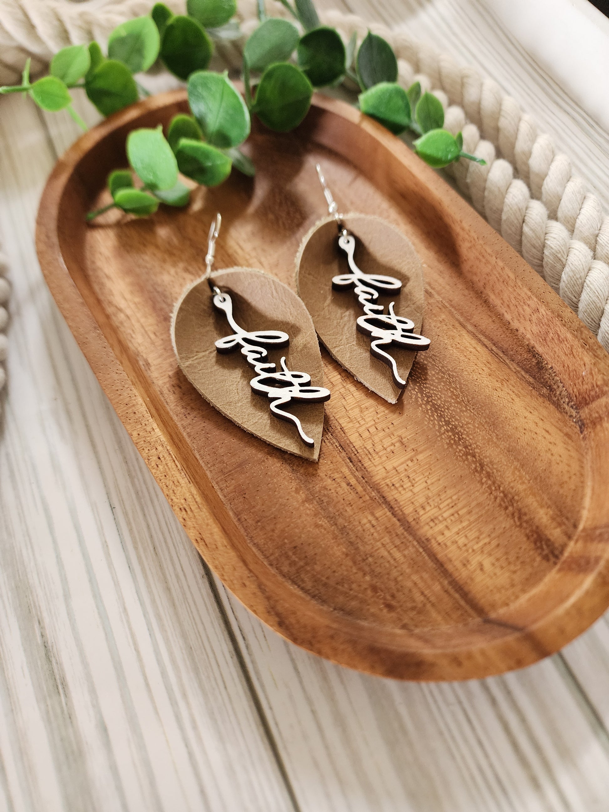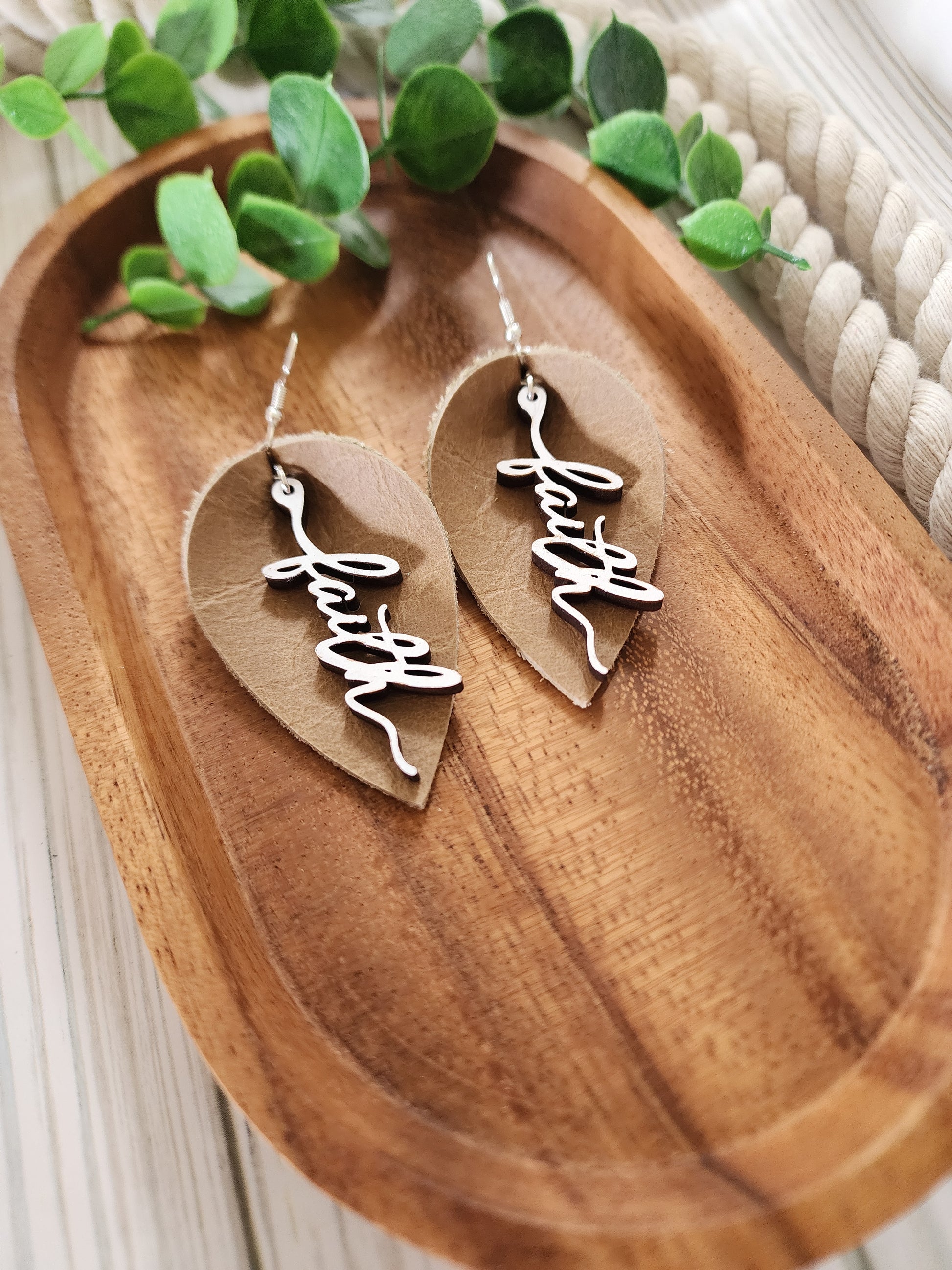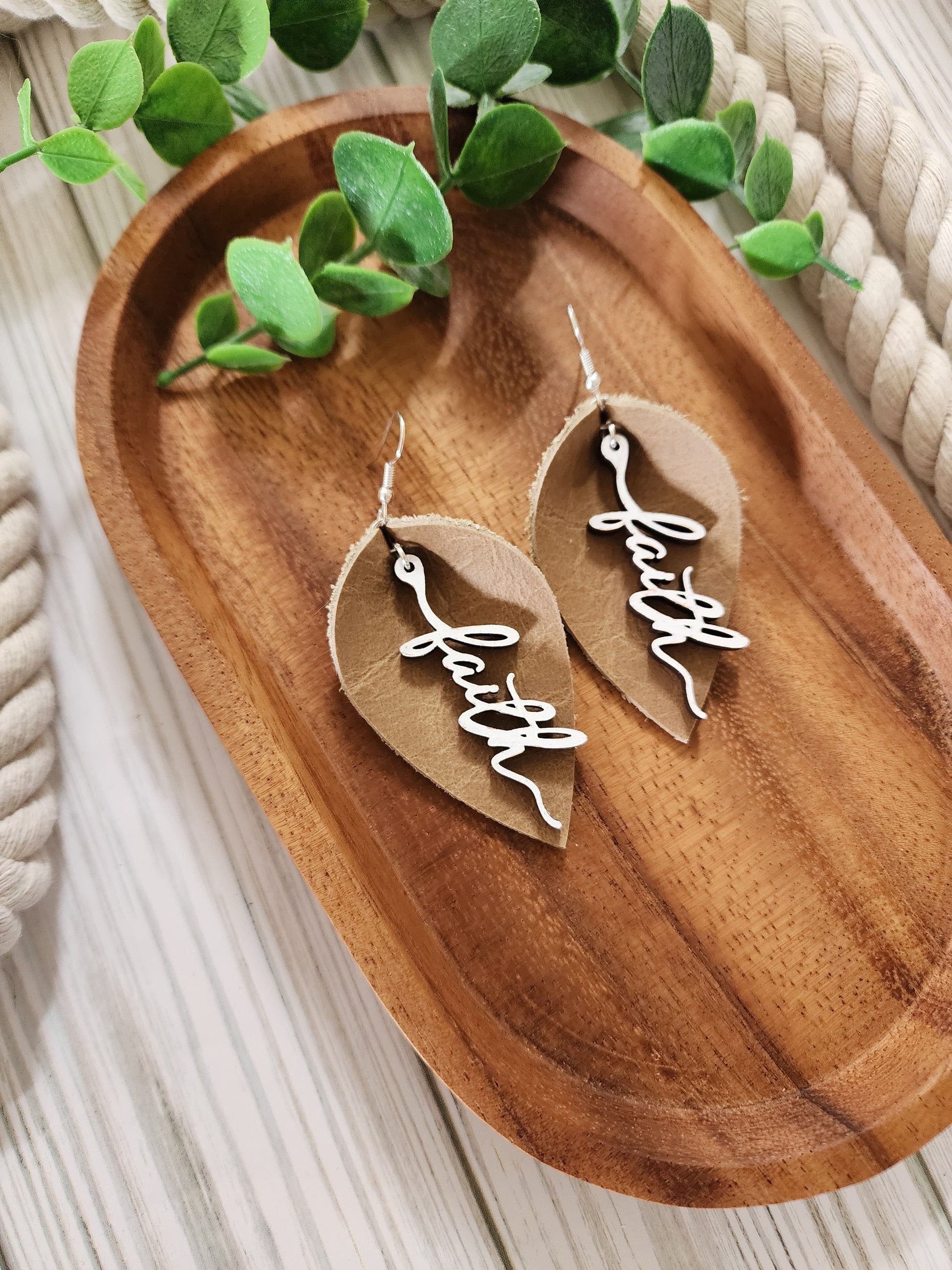 Tan Pinched Petal Leather Earrings on stainless steel hooks with white painted wood word Faith