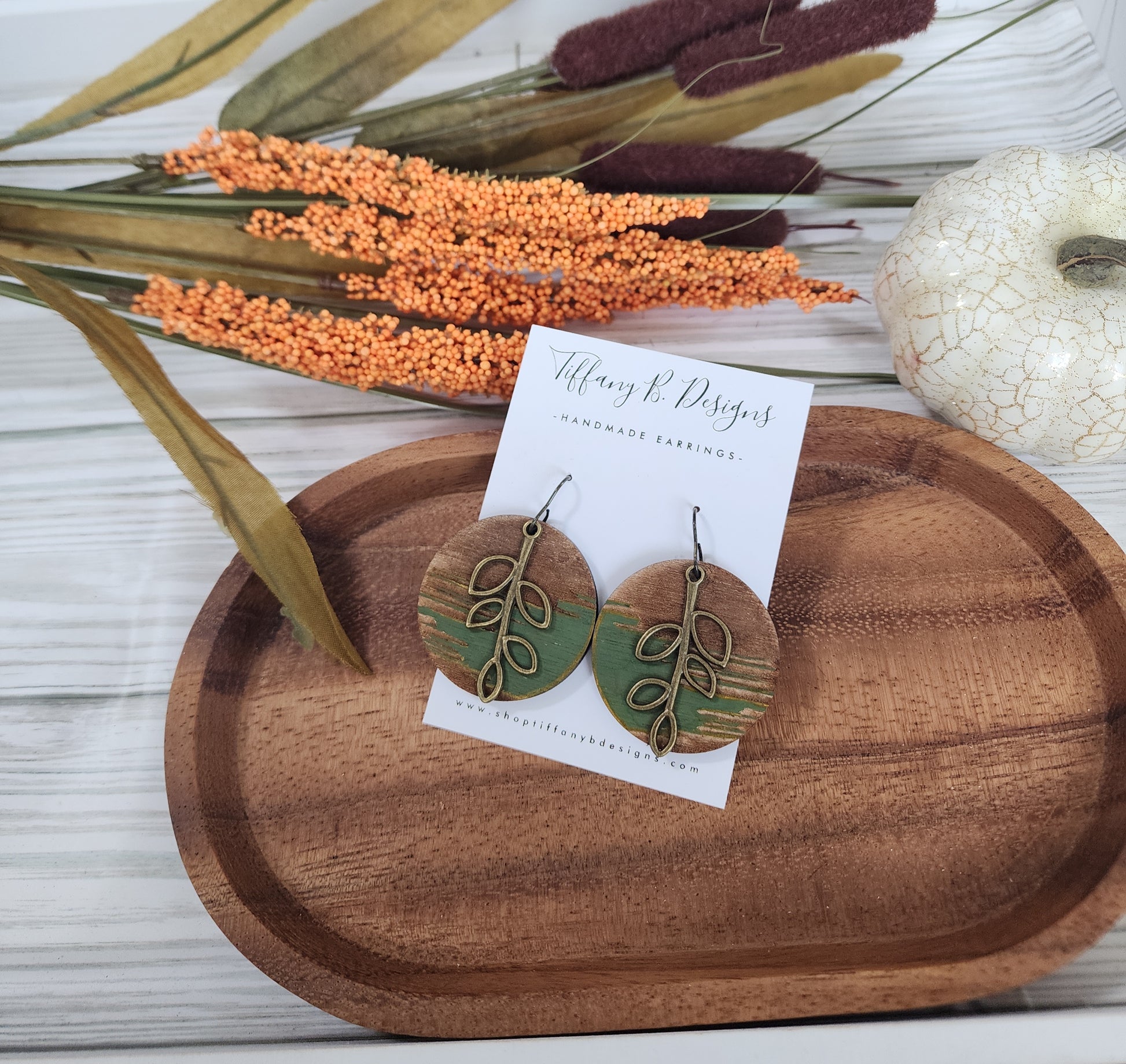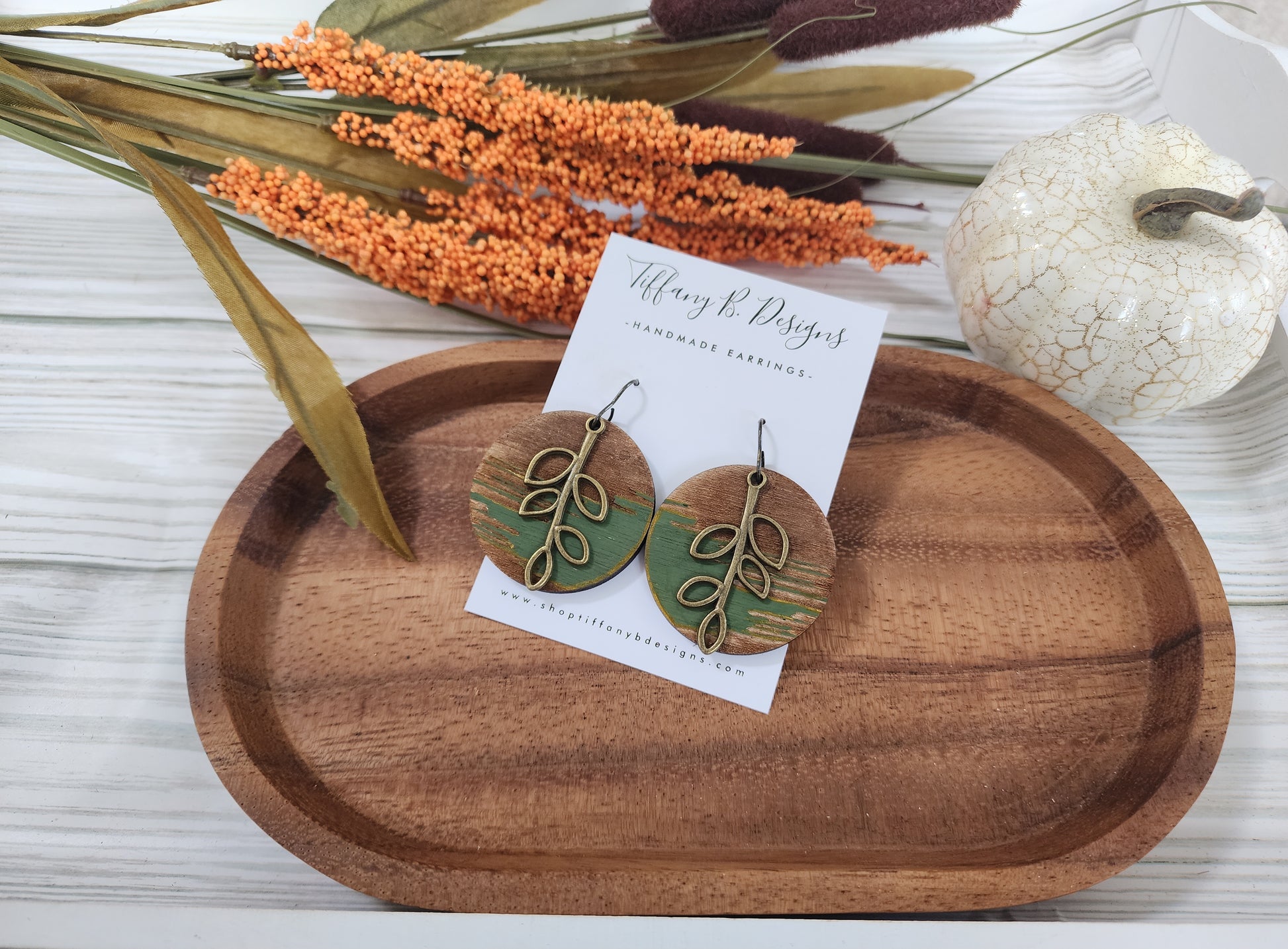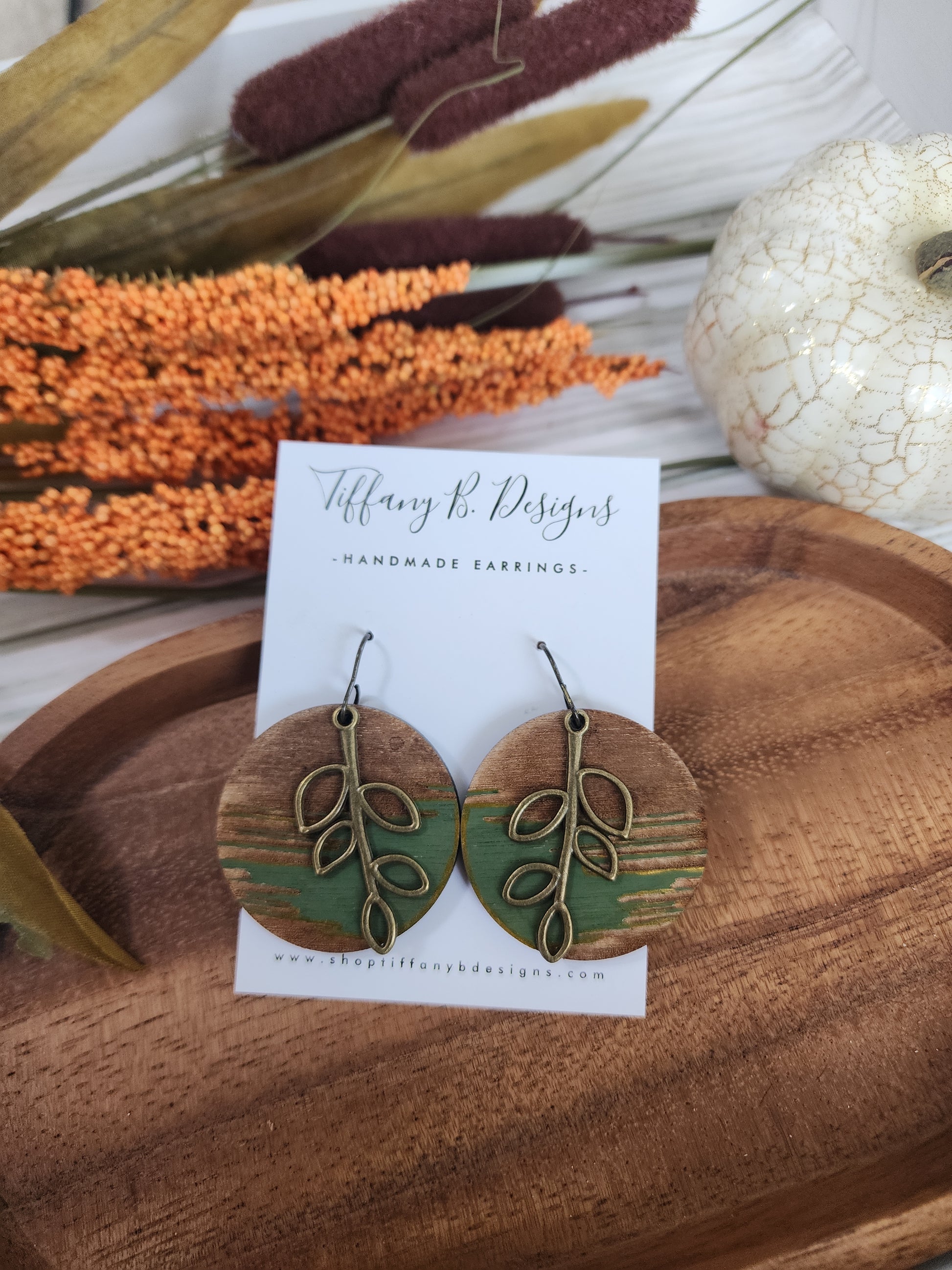 These handpainted Green with Gold accented wood earrings are sure to be a staple in your fall wardrobe! Complete with an Antique Bronze Leaf Charm and Surgical Stainless Steel Earring hook, these boho dangle earrings are an ideal earthy accessory for nearly any outfit and are extremely versatile, lightweight, and comfortable.