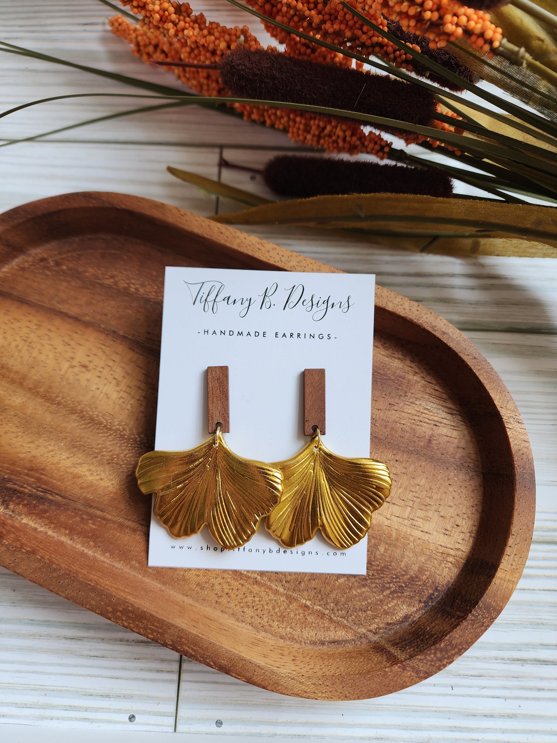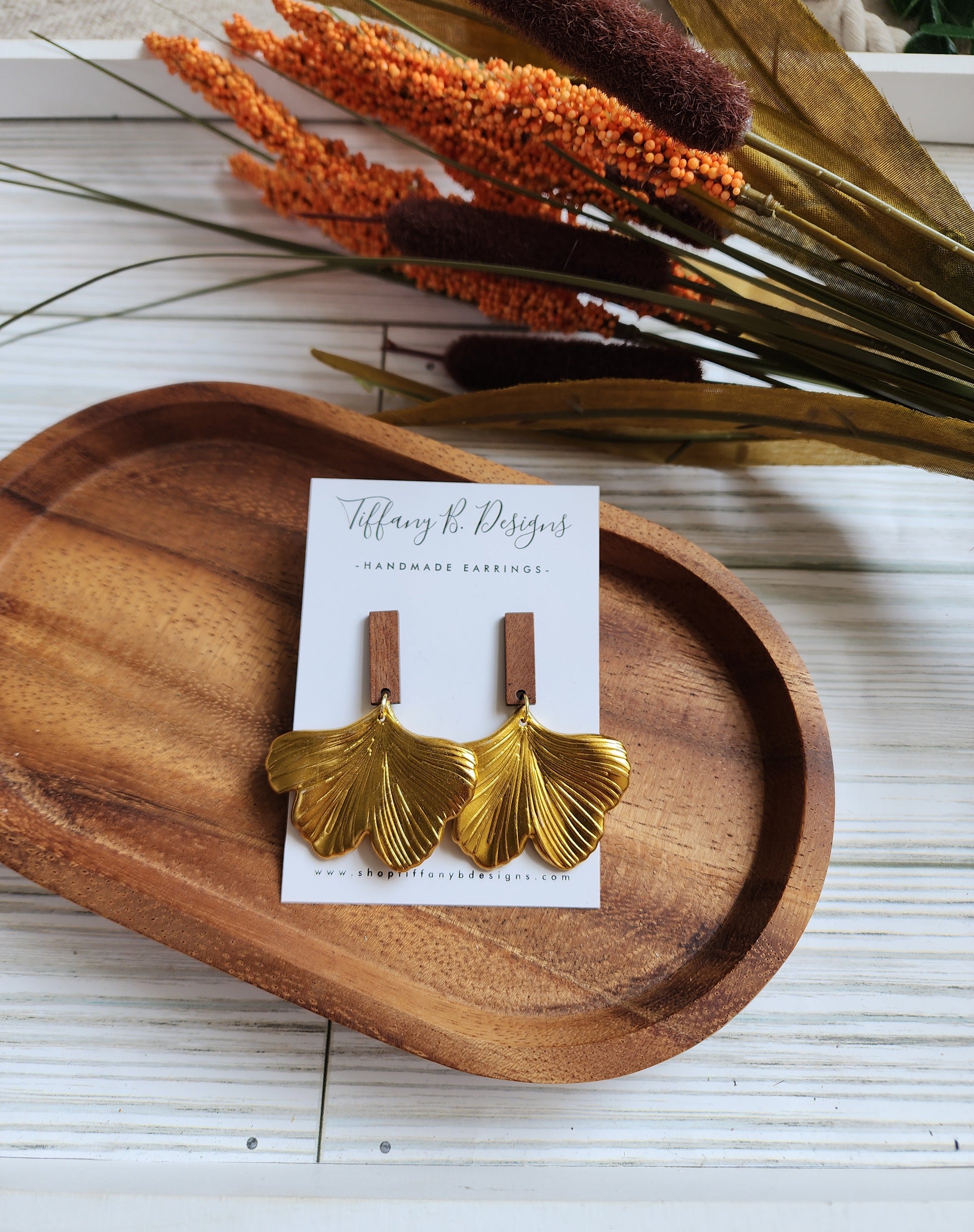 Gold Petals on a Walnut Wood Rectangle Stud with a Stainless Steel Post.