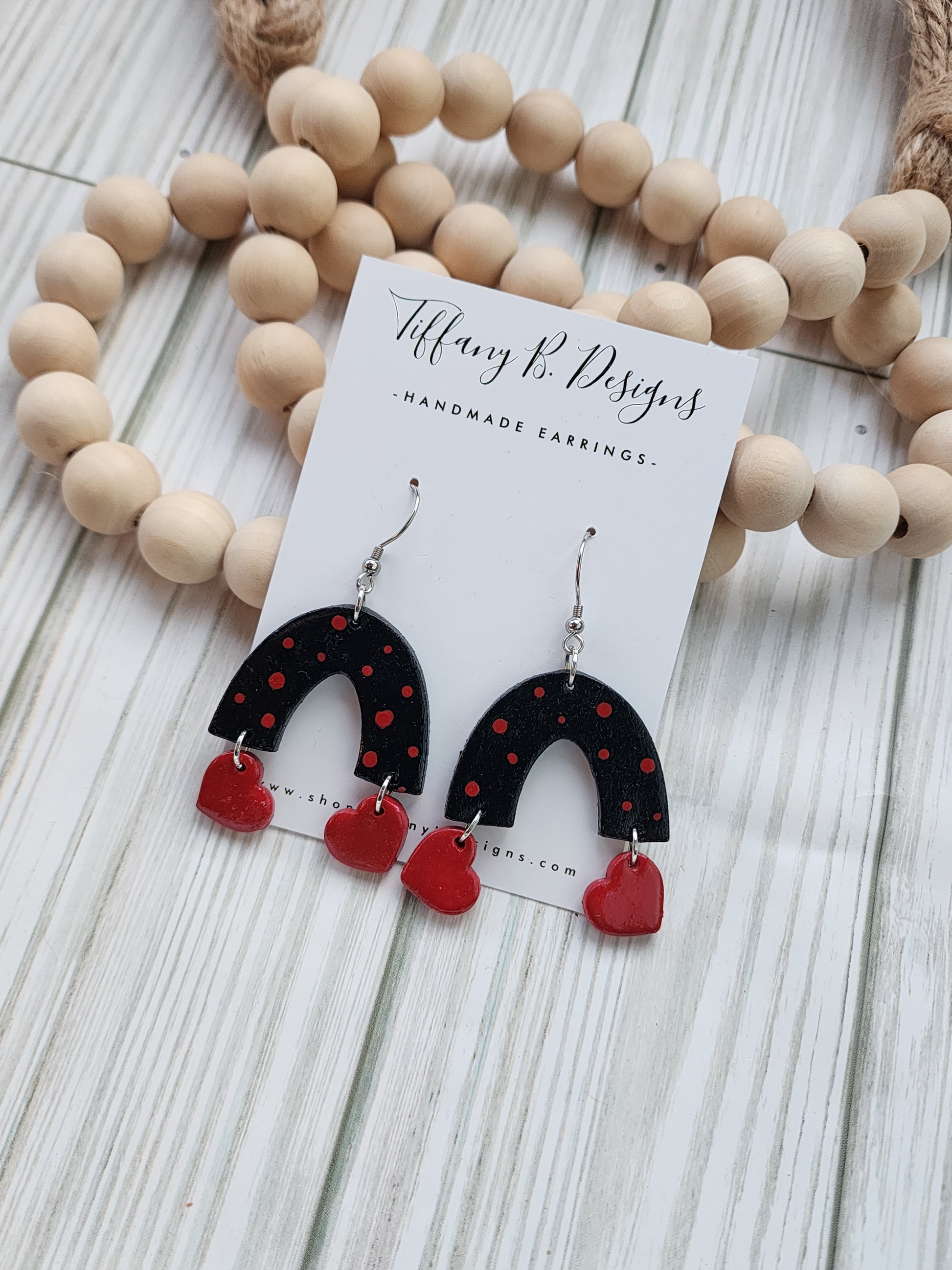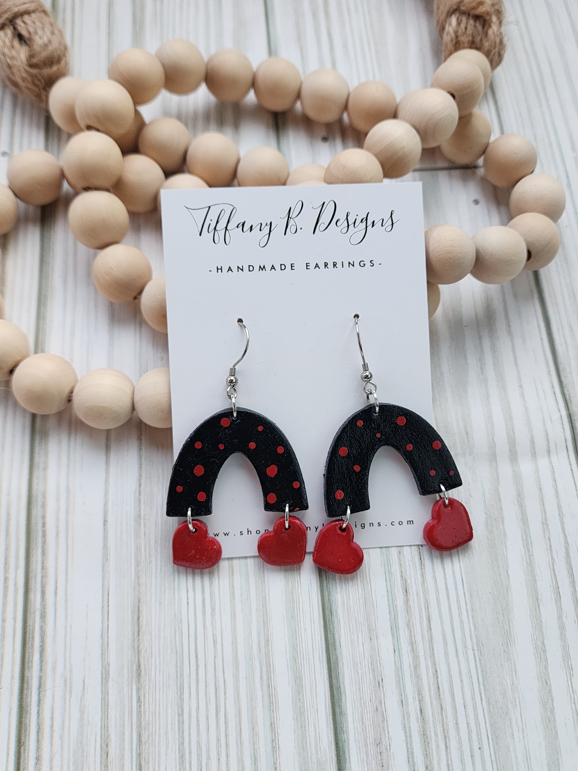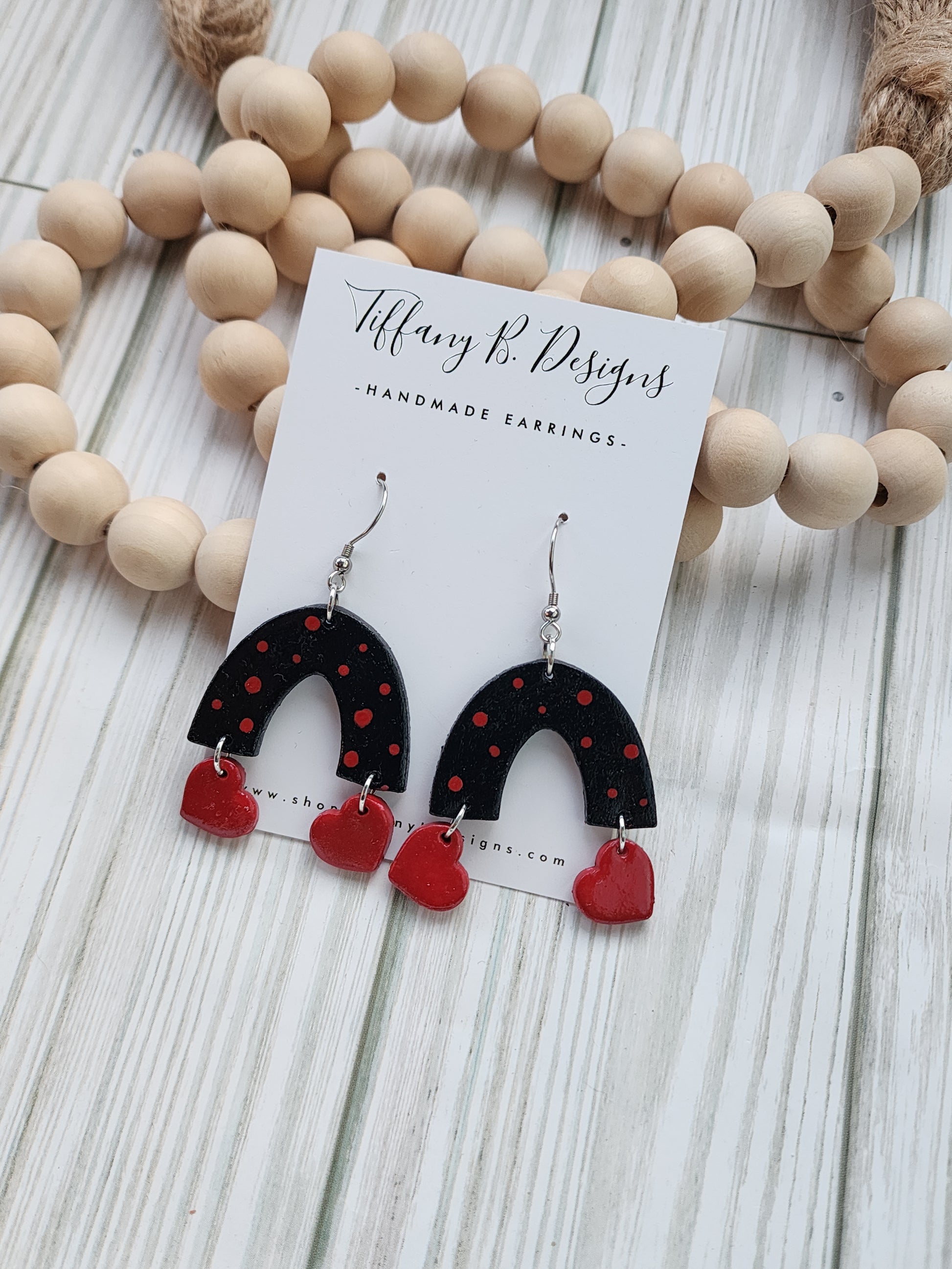 Black Clay Arches with Red Polka Dots and Two Clay Hearts with a silver stainless steel earring hook.