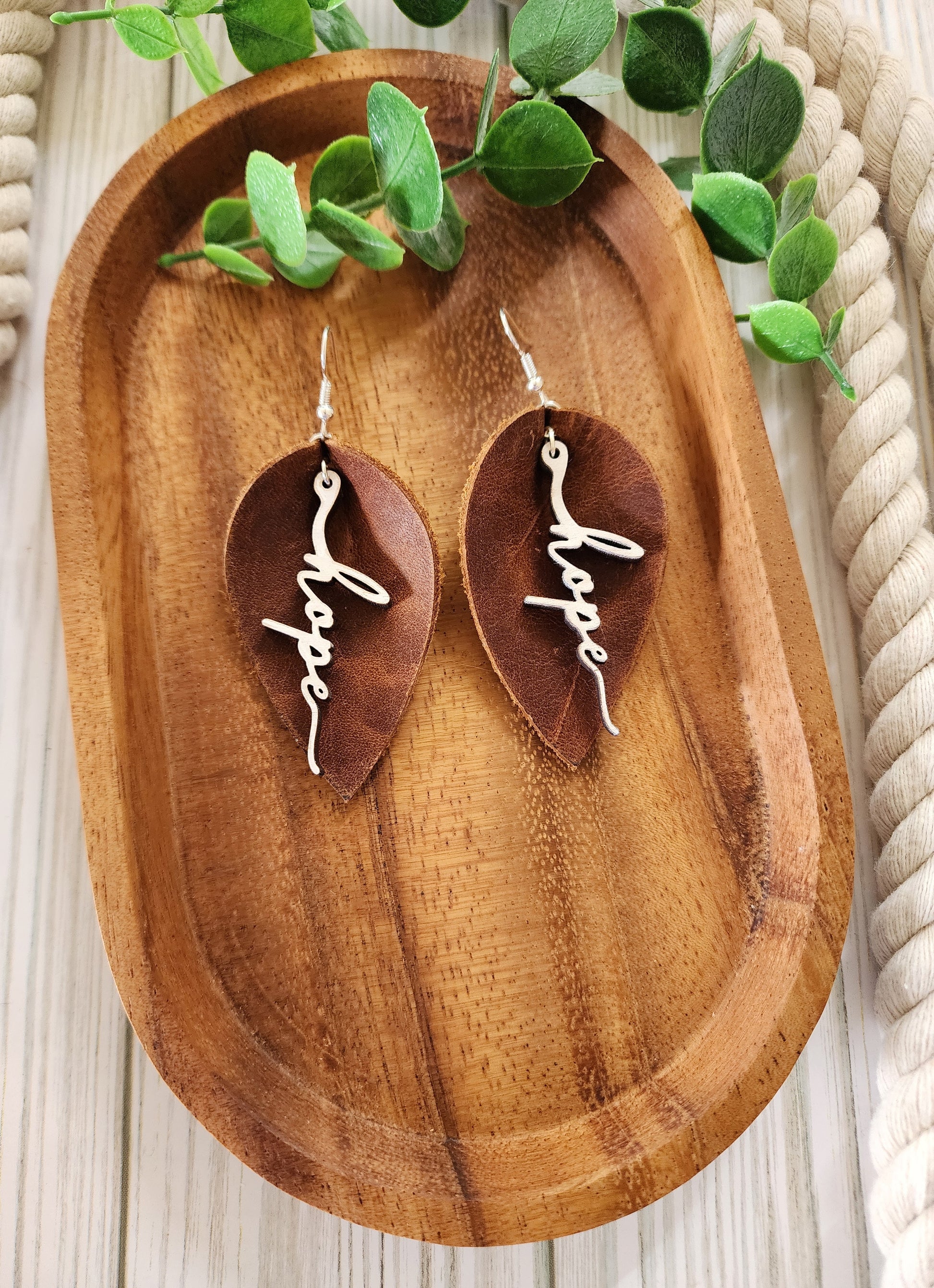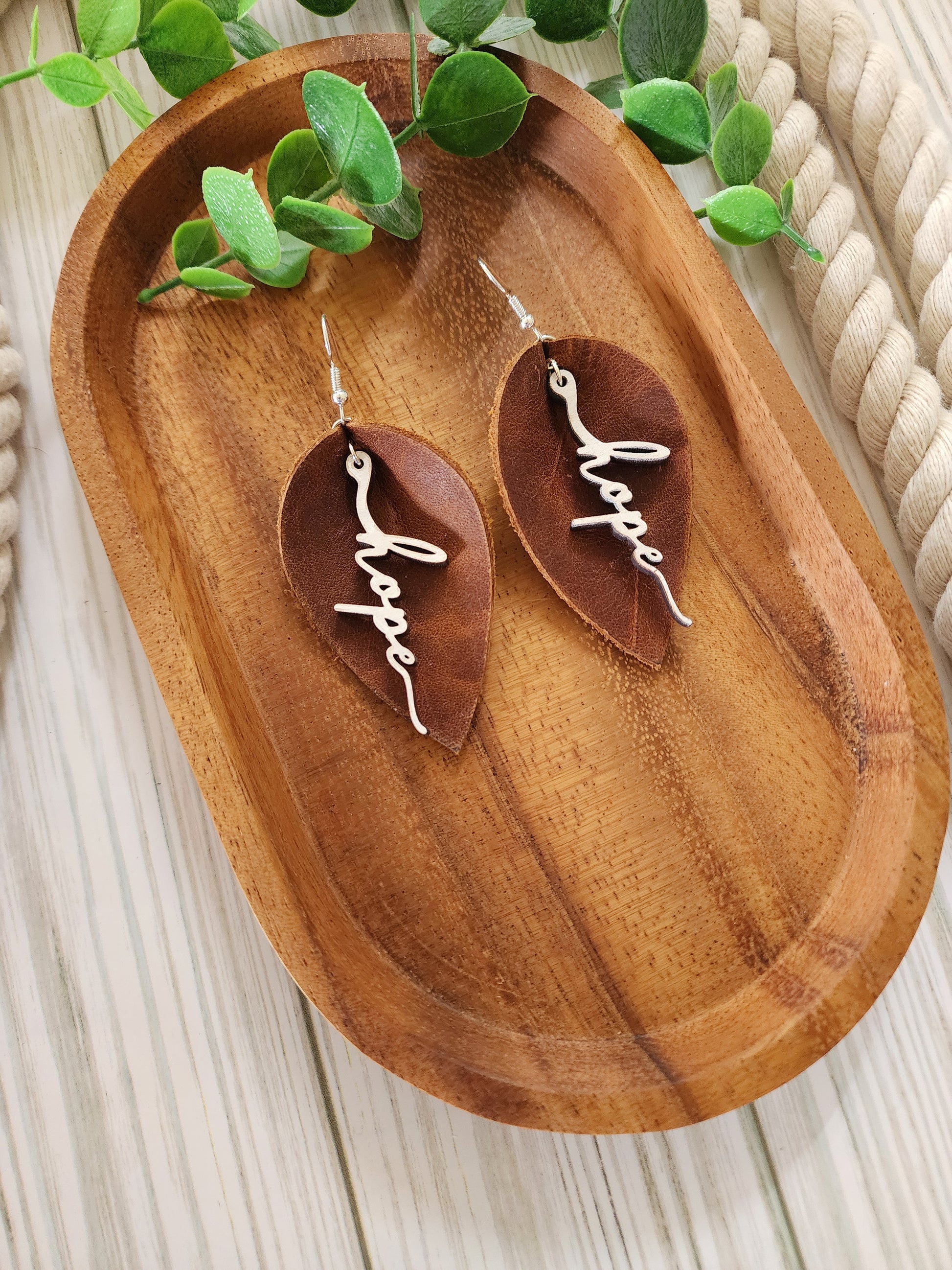 Cognac Brown Pinched Petal Leather Earrings on stainless steel hooks with white painted wood word Hope