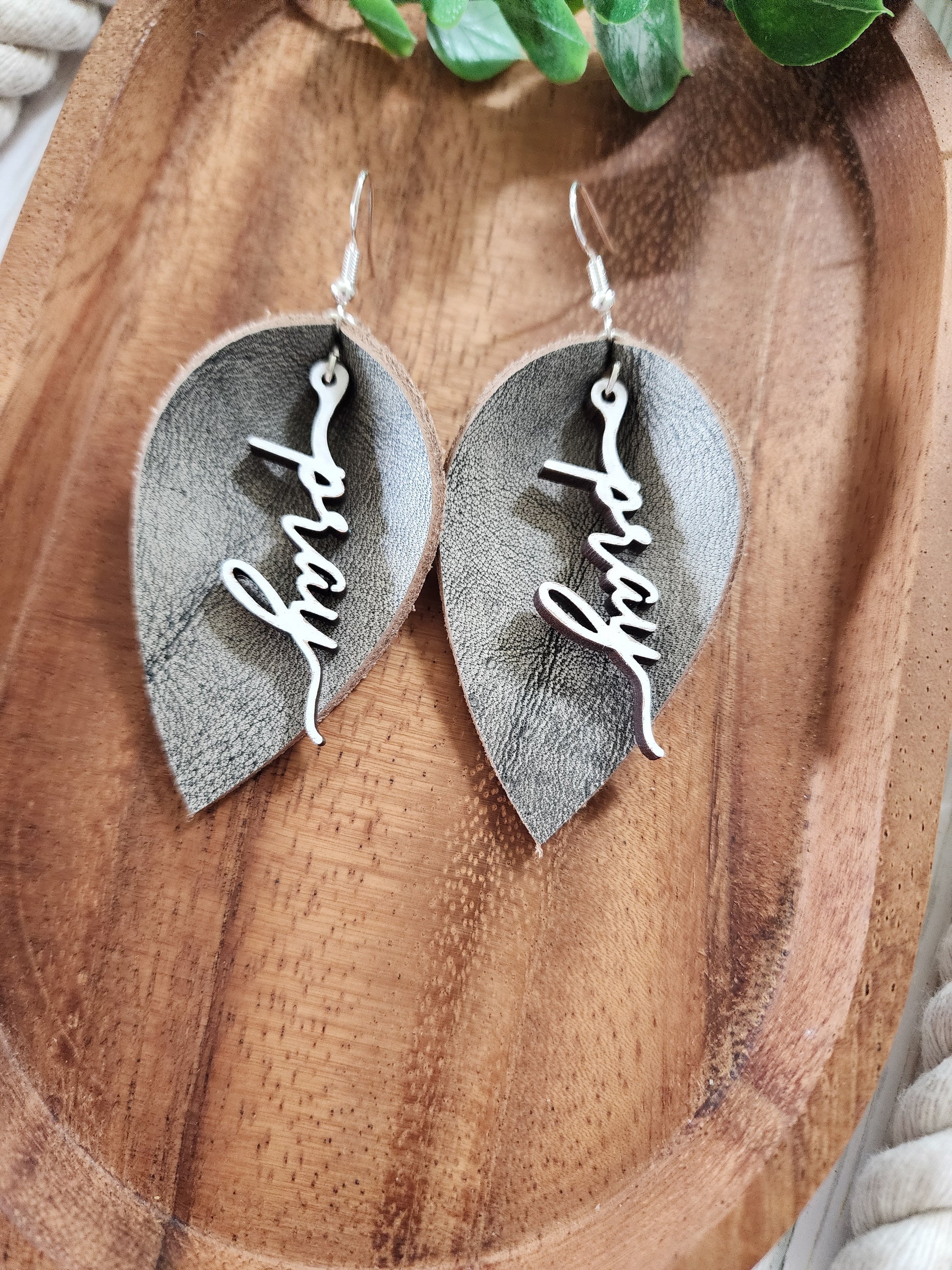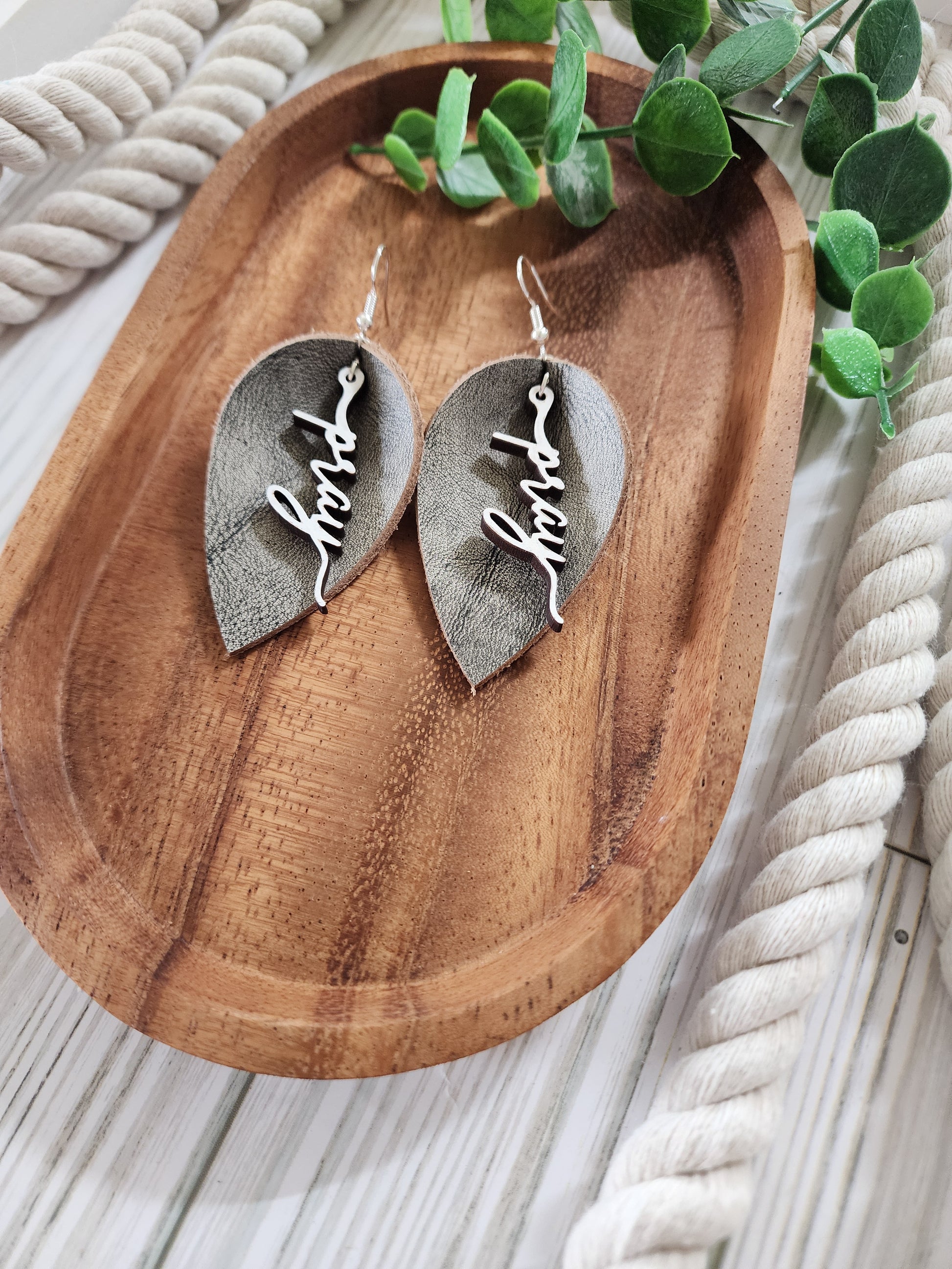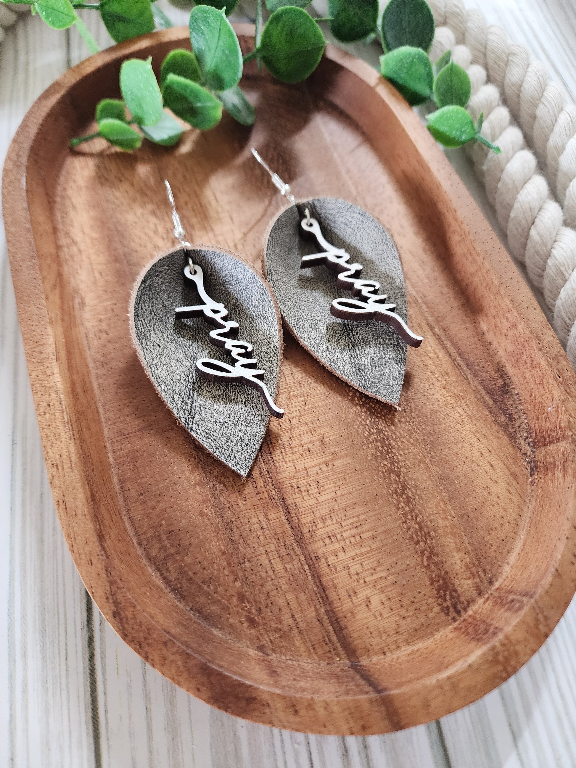 Grey Pinched Petal Leather Earrings on stainless steel hooks with white painted wood word Pray