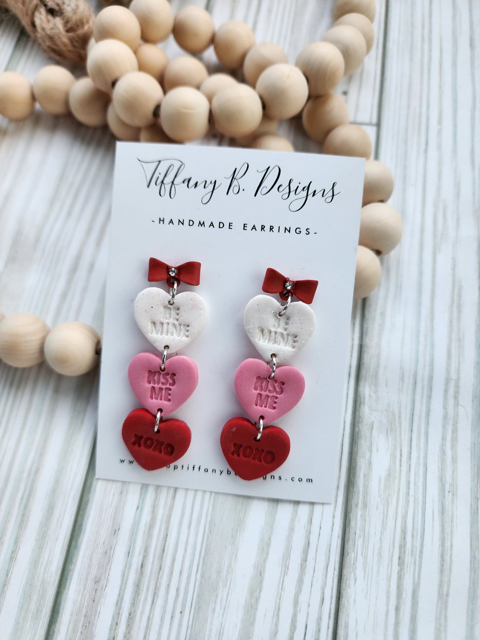 BE MINE KISS ME XOXO Red/White/Pink Clay Hearts with a Red Bow Stainless Steel Earring Stud.
